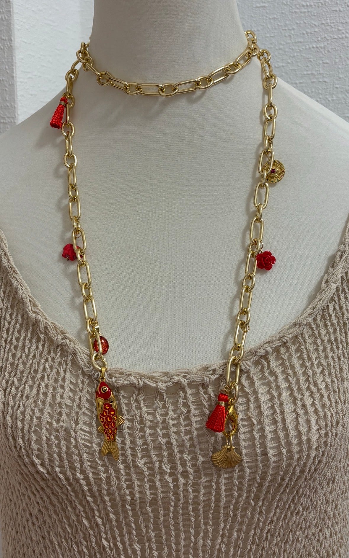 Goldfarbene Statement-Kette mit roten Anhängern - trendiger Schmuck für selbstbewusste Frauen