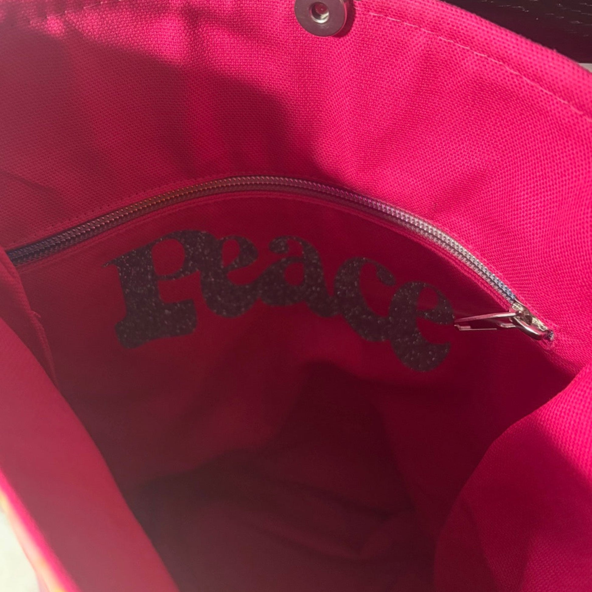 Innenfutter: Baumwollstoff in Pink, mit Schriftzug PEACE