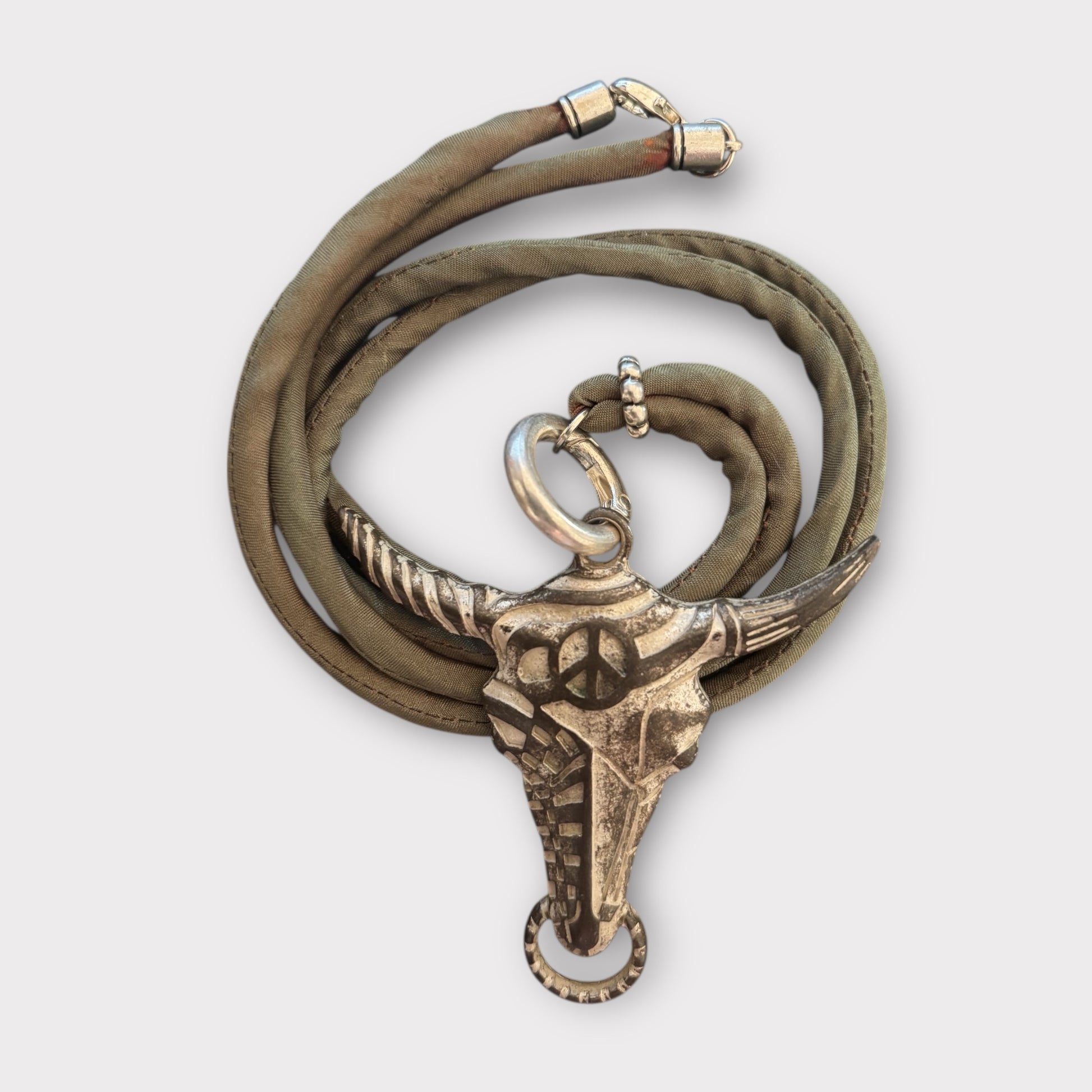 Es muss ja nicht immer Perlen sein. Diese stylische Kette steht für lässigen Boho Style. Der Anhänger in Form eines detailreich gearbeiteten Stierkopfs setzt ein kraftvolles Statement - verziert mit einem Peace Symbol als Reminder für Mut, Freiheit und innere Ruhe. Das weiche olivfarbene Seidenband verleiht dem Schmuckstück einen authentischen Look. Trage dieses Accessoire als besonderer Eyecatcher auf Festivals oder im Alltag.