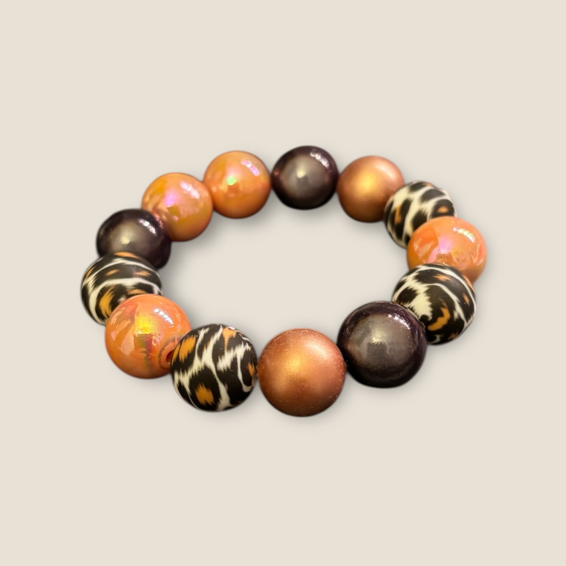 Du liebst den Leo Look ? Dieser Look kommt nie aus der Mode. Am besten man kombiniert dezent zu schlichten Basics in neutralen Farben. Dieses Perlenarmband macht ein schlichtes Outfit zum eyecatcher. Harmonisch aufeinander abgestimmten Farben der Perlen in Kombination mit Perlen im Leopardendesign machen das zauberhafte Armband zu etwas Einzigartigem. Zögere nicht, das wundervolle Schmuckstück ist ein Unikat!