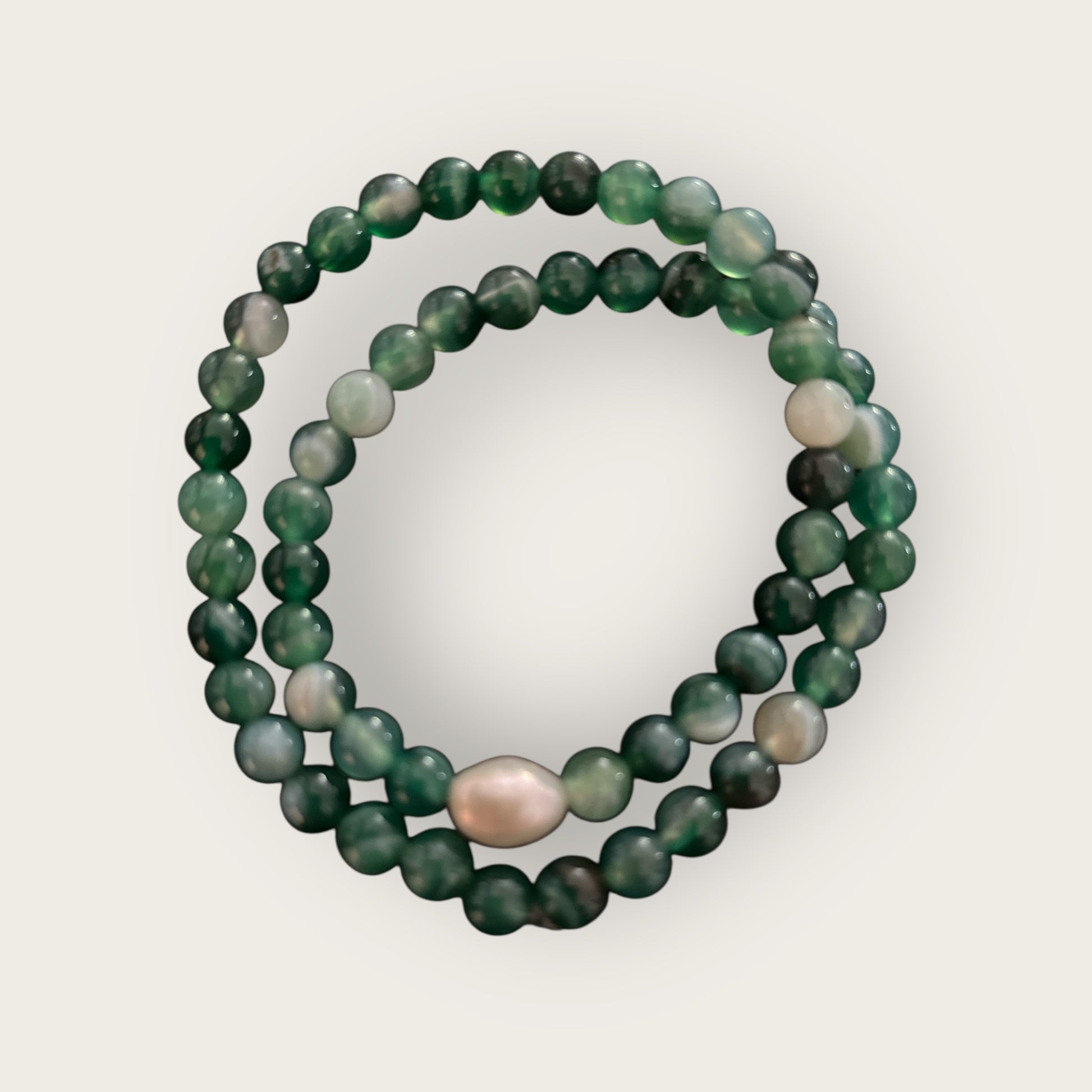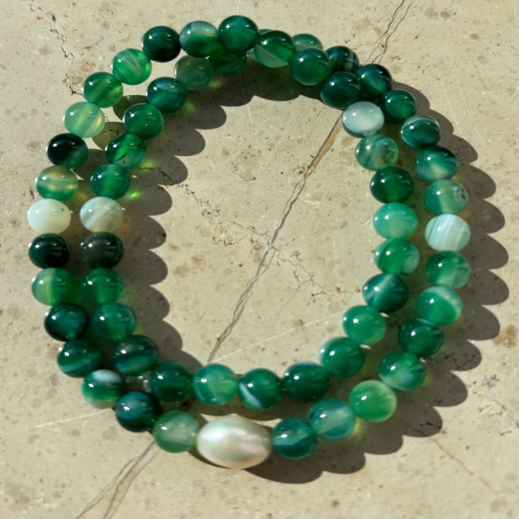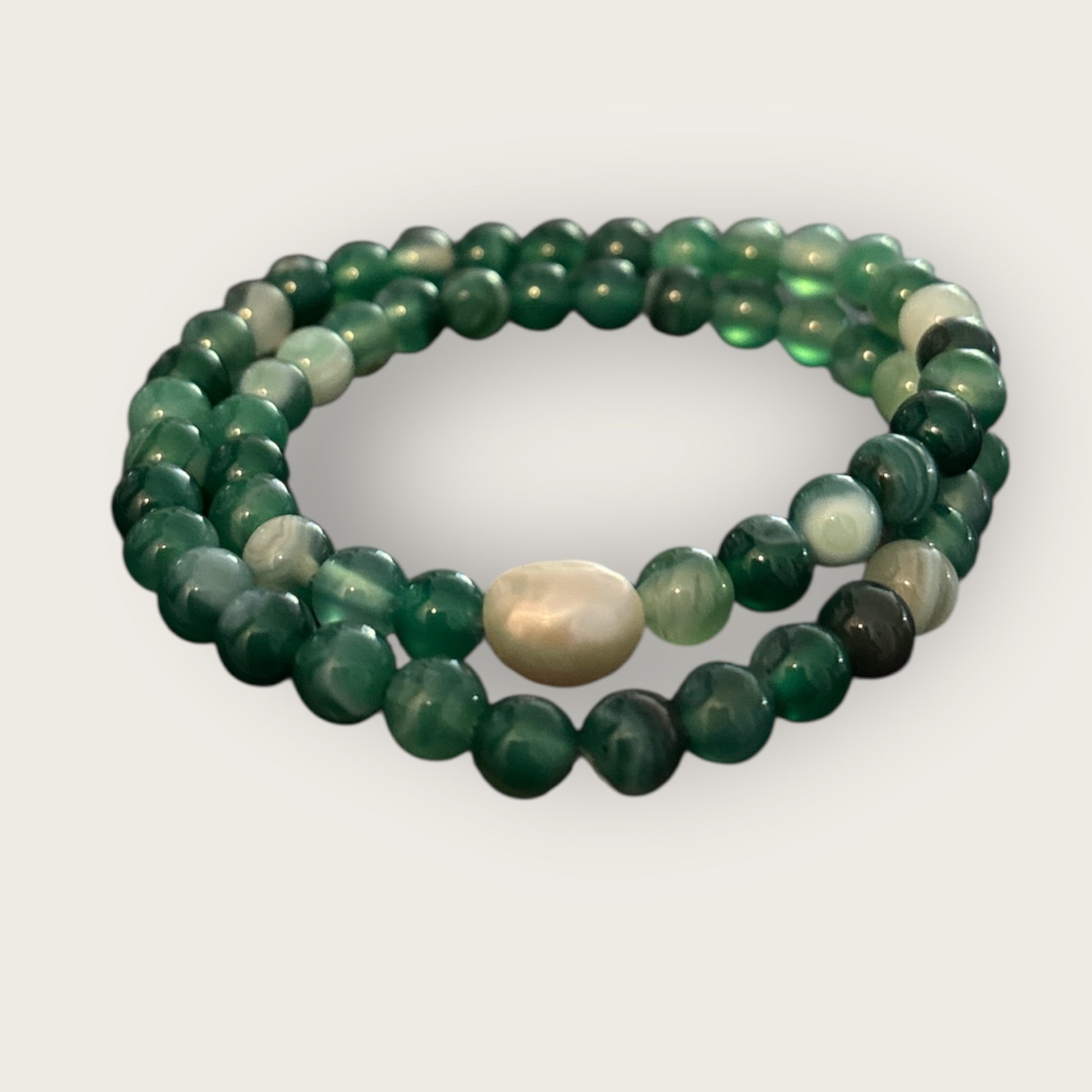 Du liebst Naturperlen und die Farbe Grün ? Das Armband Schottland besticht durch die intensiven grünen Naturstein Perlen und der kleinen Süßwasserperle. Das Schmuckstück kann zweimal um das Handgelenk gewickelt werden und passt zu allen Jahreszeiten als perfektes Accessoire. Mit diesem Unikat Schmuckstück kannst Du nur punkten und bewundernde Blicke sind Dir garantiert.